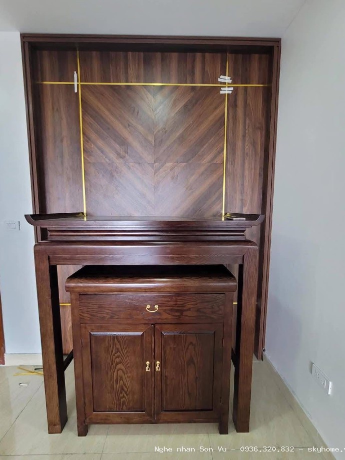 * Lưu ý: Mẫu Mẫu bàn thờ Phúc Lộc Thọ gỗ gụ màu cánh gián được Nghệ nhân Sơn Vũ tùy chỉnh kích thước riêng biệt để phù hợp với diện tích thực tế tại HÀ NỘI. Quý khách vui lòng liên hệ để nhận tư vấn theo mặt bằng căn hộ.