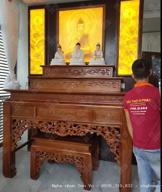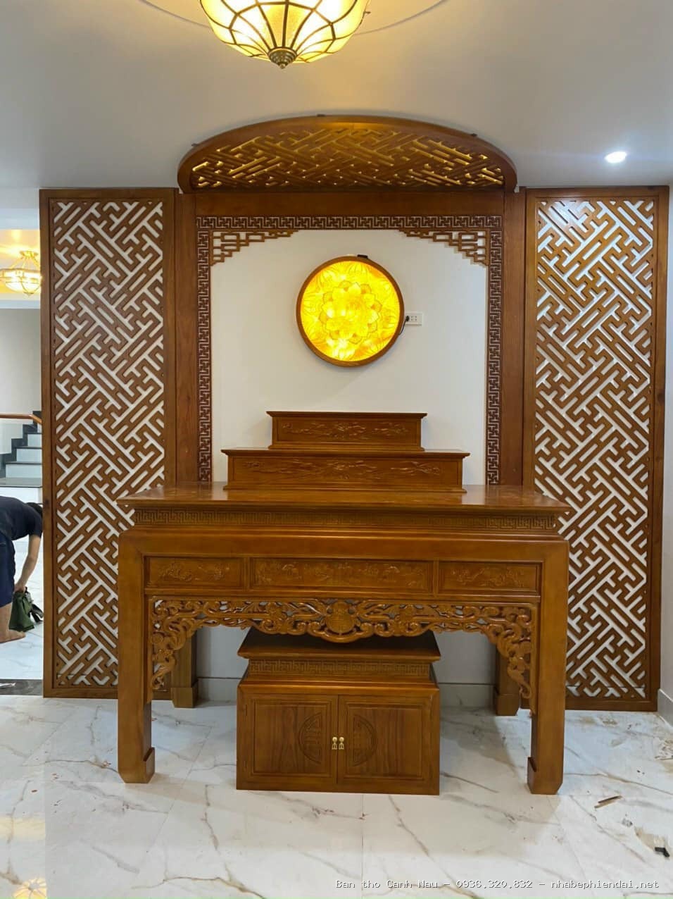 Công trình: Bàn thờ đứng gỗ sồi màu óc chó mẫu sen nền